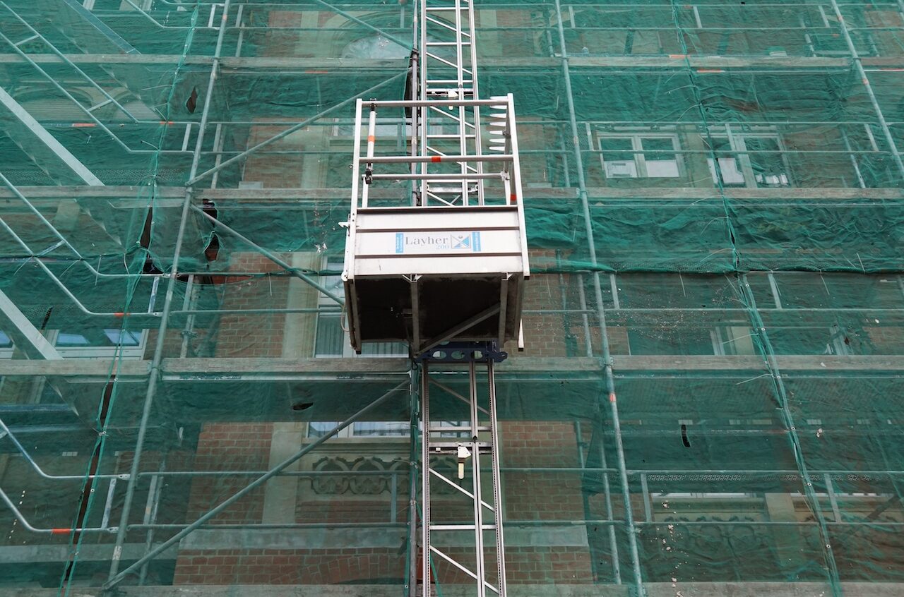 Fassadengerüst mit Lastenaufzug für Dachdecker und Fassadenarbeiten