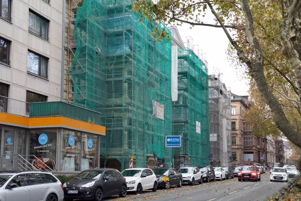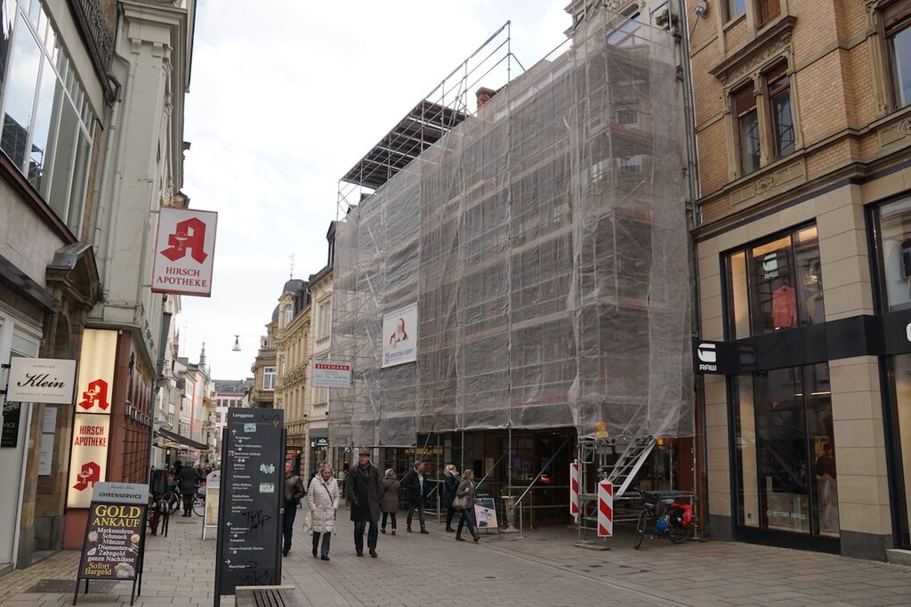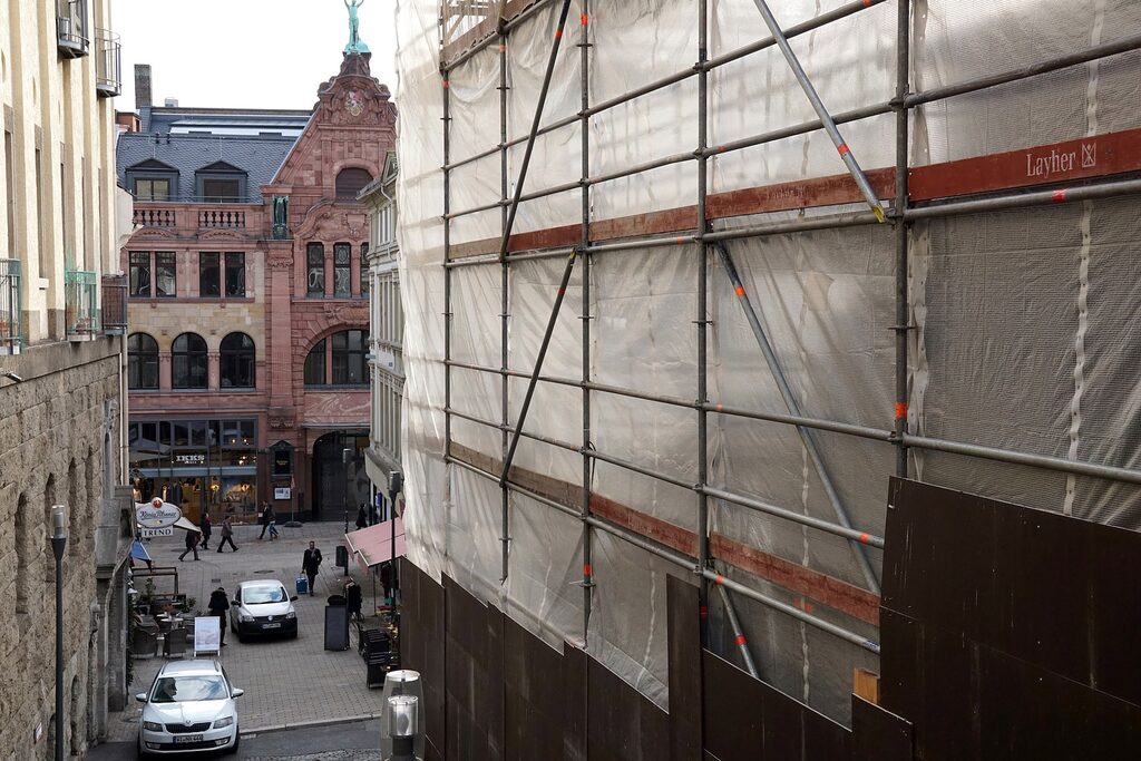 Fassadenegrüst in der Fußgängerzone Kaffee Maldaner