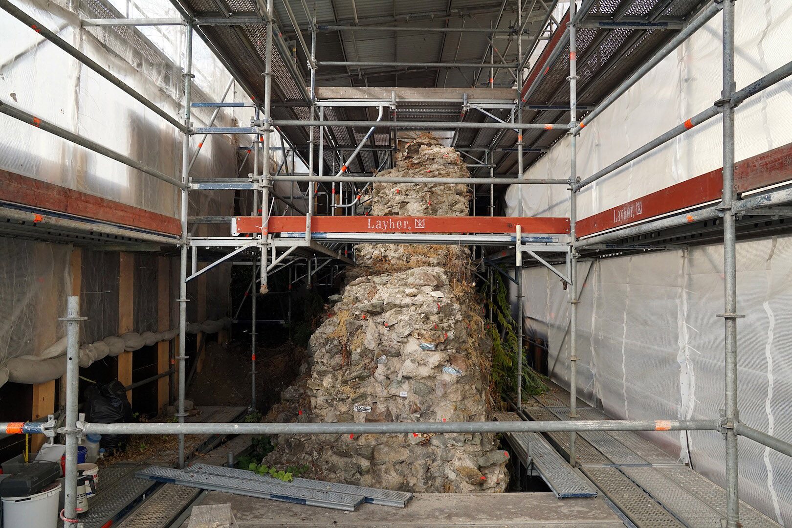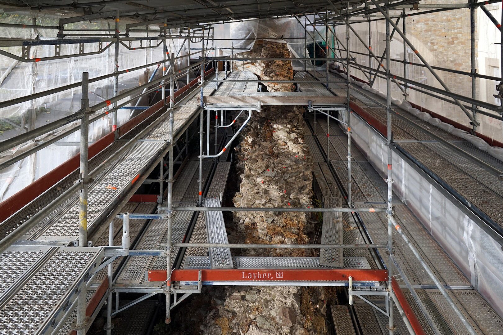 Modulgerüst am Römertor für die Restaurierungsarbeiten an der Römermauer.